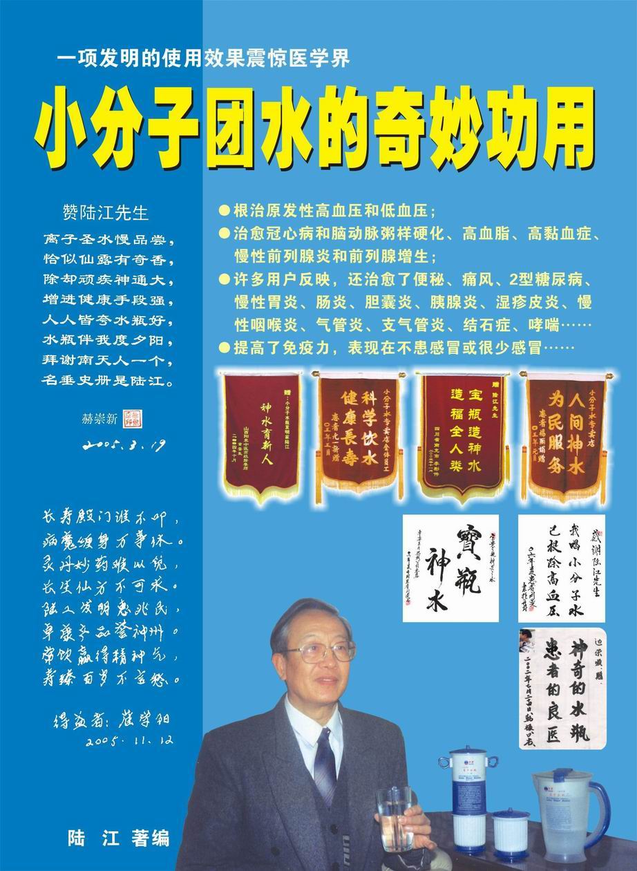 人類幾千年來患以上病癥需終生服藥,幾十年也不能治愈。可是我國南寧的高級工程師陸 江,于1990年想根治高血壓,研究發(fā)明了離子水瓶,處理出微小分子團水供飲用,經(jīng)過醫(yī)院臨床試用和專家鑒定,1999年獲中國發(fā)明專利權(quán),產(chǎn)品于2000年投放市場后一直跟蹤調(diào)查,據(jù)全國各地用戶反饋:祛除了高低血壓、糖尿病和冠心病,并使前列腺增生、咽喉炎、鼻竇炎、慢性氣管炎、支氣管炎、矽肺病、哮喘、慢性胃炎、腸炎、慢性膽囊炎、慢性腎炎、腎衰、膀胱炎、便秘、痔瘡、風濕性關(guān)節(jié)炎和濕疹皮炎及中風后遺癥等病癥不藥而愈。為什么喝微小水能治20多種病?陸 江從1991年德國科學(xué)家發(fā)現(xiàn)細胞膜水通道僅為2納米獲得啟發(fā),認為多種器官患病是因細胞脫水,不能正常代謝和分裂增殖,才使器官細胞減少致衰弱萎縮而形成細胞缺水性病癥。22年來的實踐有力地支持了“細胞脫水致病”這一重要論點,表明喝微小水可滿足細胞的生理需求,補水就能祛病,是生命科學(xué)新亮點。
