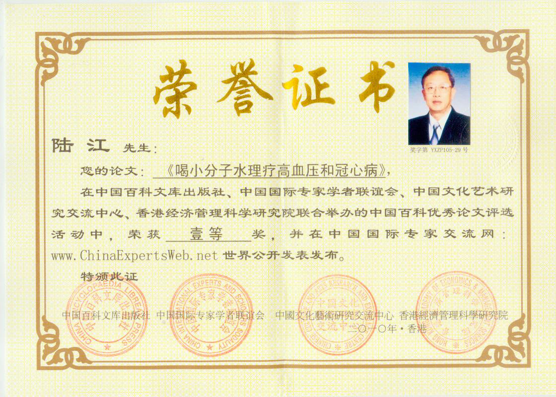-----我是從事建筑的高工,本來沒有資格去攻克醫(yī)學(xué)難題,卻為了自身健康才扣響醫(yī)學(xué)的大門。由于我1990年患高血壓,因怕中風才研究發(fā)明了離子水瓶,我把水處理成微小分子團水,飲用后治愈了高血壓。便于1993年底送到三家省級醫(yī)院做臨床試用4個月。經(jīng)北京和廣西醫(yī)學(xué)專家鑒定:"降脂降壓效果好"," 能擴大心腦動脈流量,改善心腦電圖以及微循環(huán)","對治療心腦動脈粥樣硬化、高血壓、高血脂有良好的醫(yī)療保健作用。""產(chǎn)品的技術(shù)性能和療效達到了同類產(chǎn)品的國內(nèi)領(lǐng)先水平,經(jīng)廣西醫(yī)學(xué)科學(xué)情報研究所檢索,未見國外有類似報道。"中國醫(yī)學(xué)科學(xué)院張正國教授從美國國立醫(yī)學(xué)圖書館數(shù)據(jù)庫存Medline檢索英俄文資料,均未見類似報告。2000年上市后,我為了對消費者負責而繼續(xù)觀察研究,一直通過《信譽卡》和《質(zhì)量跟蹤調(diào)查書》向患者承諾療效,請用戶使用6個月后反饋效果。和脂壓患者飲用2至5個月內(nèi),消除癥狀,停服藥物,血壓正常;冠心病患者飲用3~5個月逐漸減輕至消除心絞痛、房顫等癥狀,不再服藥,飲用1年左右心電圖正常,經(jīng)冠脈造影掃描無明顯狹窄,表明冠心病痊愈。大量患者還反映許多衰弱器官被修復(fù),讓前列腺增生、慢性咽喉炎、慢性氣管炎、支氣管炎、慢性胃炎、腸炎和膽囊炎等不藥而愈;2型糖尿病患者是因為胰島衰弱致病,飲用該水半年至一年,逐漸減藥至停藥,血糖尿糖正常,真正治愈2型糖尿病。中風后遺癥患者飲用六七個月,可逐漸減輕至消除肢體和語言障礙,表明飲用該水能讓壽命很長的神經(jīng)元細胞逐漸修復(fù),奇跡般地恢復(fù)肢體和語言功能。飲用后還使胸腺和脾臟兩個重要的免疫器官被修復(fù)和增強,產(chǎn)生免疫細胞多,提高了免疫力,使人不生病或少生病。自此, 飲用微小分子團水創(chuàng)造了攻克冠心病、高(低)血壓和糖尿病三大醫(yī)學(xué)難題的奇跡。人們對此感到不可思議,但實踐是檢驗真理的唯一標準。
